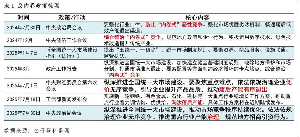“反内卷”,应是近一个季度以来国内政策最火热的“关键词”之一。这一政策从中央顶层设计到各部委分工计划,再到各行业协会奔走呼号,最终传导至各行业、各市场、各商品,在全国多个重点行业中掀起了一场关于价格调整、产能调控、市场竞争行为规范的“风暴”,成为了影响2025年下半年甚至2026、以及更长远“十五五”期间重要的政策风向。